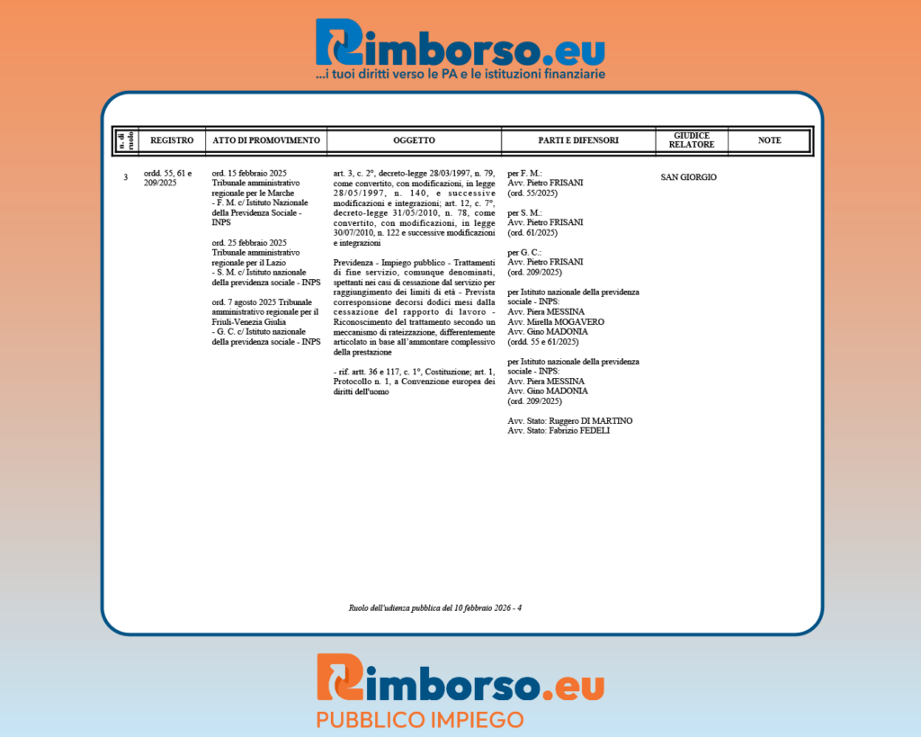 L’Avv. Pietro Frisani, capo staff legale di rimborso.eu, il 10 febbraio 2026 discuterà davanti alla Corte Costituzionale la questione del Trattamento di Fine Servizio nel pubblico impiego, con riferimento ai tempi di pagamento e al meccanismo di rateizzazione.